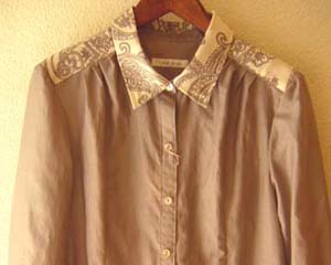 ヨーク(肩の切り替え)と衿を柄の別生地にしています。後ろのベルトも同じ柄に。もちろん全部同じ生地でも構いません。