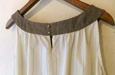 衿ぐりに切り替えが入った、ギャザー感たっぷりのワンピース。切り替えは違う生地を使用すると◎