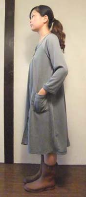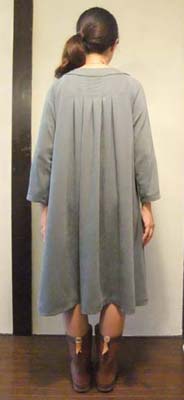 前後にたっぷりタックを取ったワンピース。裏地はついていませんので、重ね着にも重宝します。