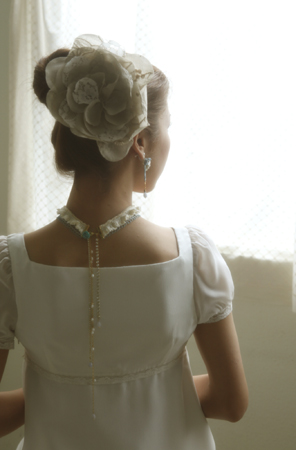 ハイウエストの切り替えと袖口には、ごく繊細な淡いピンクのシルクリボンと、アンティークレースを縫いつけています。