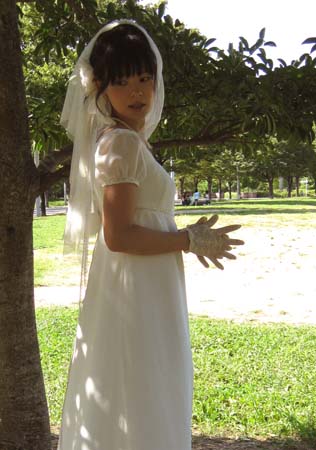 このドレスに合うのは、薄いチュールのショートヴェール。もちろんロングでも合いますが、ショートヴェールにショートグローブでもかわいいです。